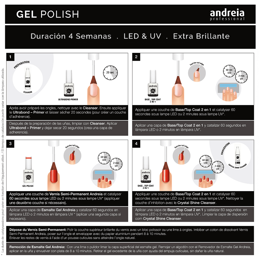 Base/Top Coat para aplicación del esmalte de gel andreia, con una excelente adherencia y un acabado de alta resistencia.